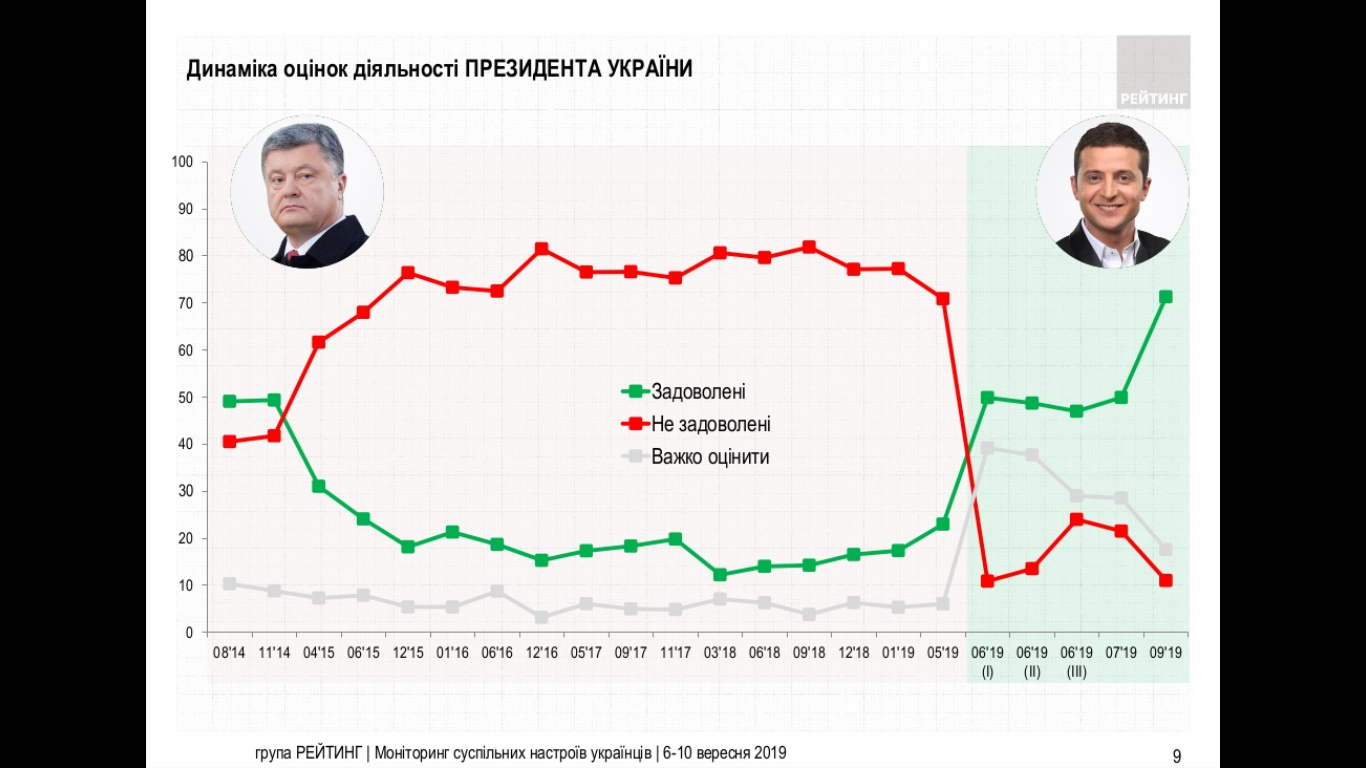Около 71% опрошенных украинцев довольны деятельностью президента Владимира Зеленского. Об этом свидетельствуют данные опроса, проведенного группой "Рейтинг" 6-10 сентября.