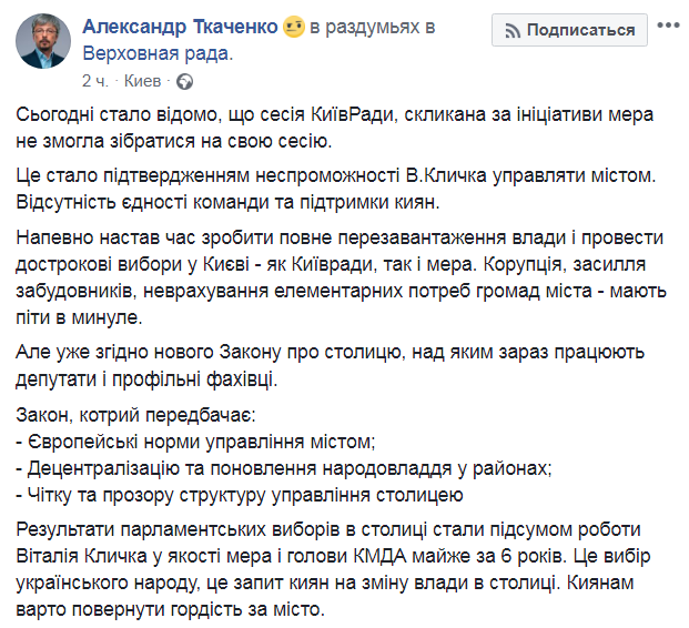 "Это стало подтверждением несостоятельности Кличко управлять городом", - констатировал Ткаченко.