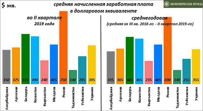 В то же время украинская средняя зарплата в номинальном долларовом выражении остается меньше, чем в половине стран СНГ. "В рейтинге стран СНГ впереди Украины - РФ, Беларусь, Казахстан и Молдова. Украинская средняя начисленная зарплата выше, чем во всех остальных среднеазиатских и южнокавказских странах, кроме Грузии, но она уже не в СНГ", - отмечает автор публикации.