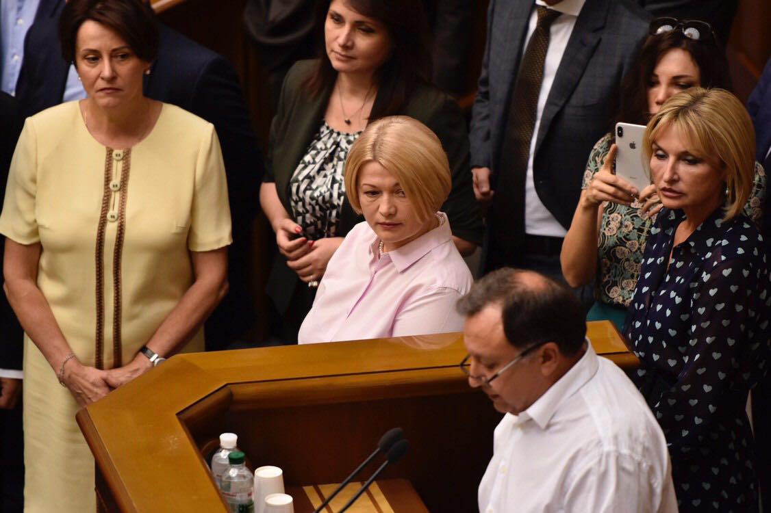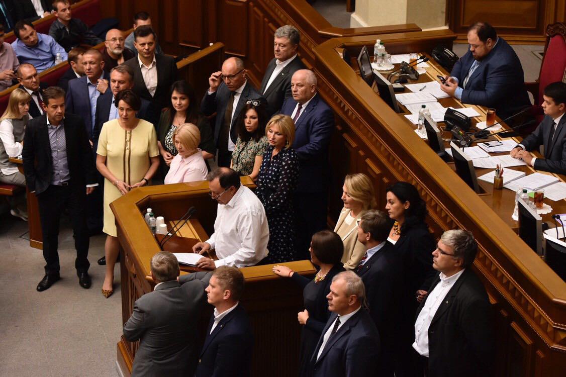 За трибуну встал нардеп Николай Княжицкий, вместе с ним вышли представители "Евросолидарности" в Раде: Петр Порошенко, Андрей Парубий, Ирина Геращенко, Ирина Луценко и другие.
