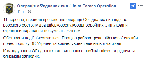 "11 сентября, в районе проведения операции Объединенных сил во время вражеского обстрела двое военнослужащих Вооруженных Сил Украины получили ранения не совместимые с жизнью.  Обстоятельства происшествия выясняются. Работает рабочая группа военной службы правопорядка ВС Украины и командования воинской части", - говорится в сообщении.