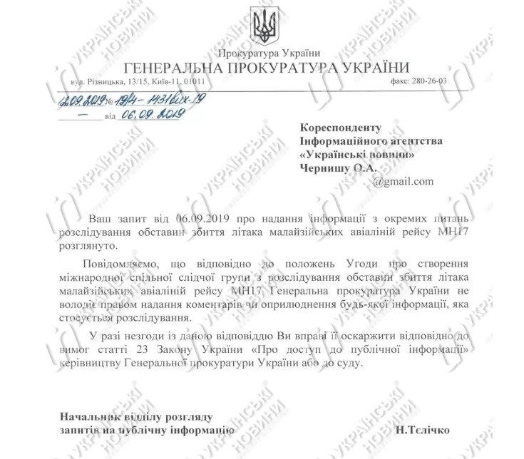 Уточняется, что агентство просило в запросе подтвердить информацию, что Нидерланды направляли письмо в Украину с просьбой провести допрос Цемаха и получили согласие на эту процедуру.
