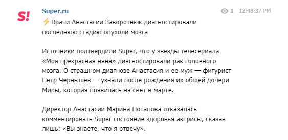 Как пишет в своем Telegram-канале российское издание Super, врачи диагностировали у Анастасии Заворотнюк последнюю стадию опухоли мозга.