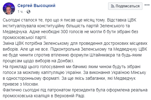 "Сегодня произошло то, о чем я писал еще месяц назад. Отставка ЦИК институциализировала конституционное большинство партий Зеленского и Медведчука. Ведь необходимые 300 голосов не могли быть собраны без промосковской партии.