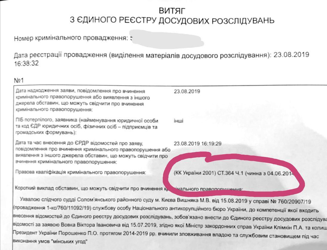 Заявитель - бывший депутат-ляшковец Виктор Вовк - считает, что Климкин и Порошенко в течение 2014-2019 годов систематически злоупотребляли властью во время "выполнения так называемых минских соглашений".