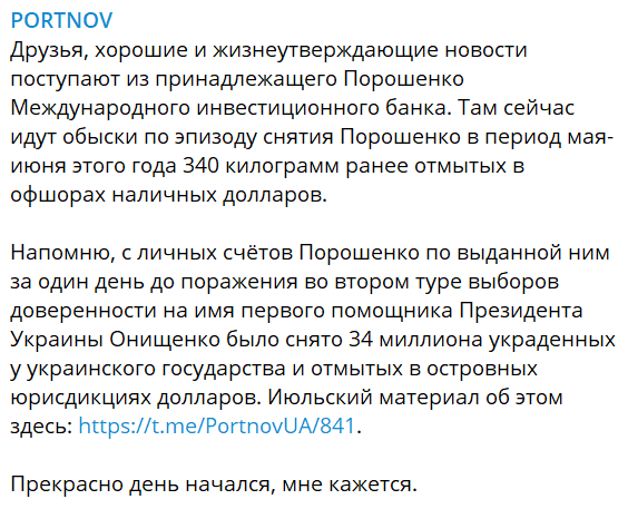 Напомню, с личных счётов Порошенко по выданной ним за один день до поражения во втором туре выборов доверенности на имя первого помощника Президента Украины Онищенко было снято 34 миллиона украденных у украинского государства и отмытых в островных юрисдикциях долларов", - написал юрист в Telegram.