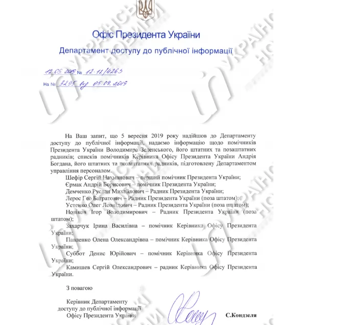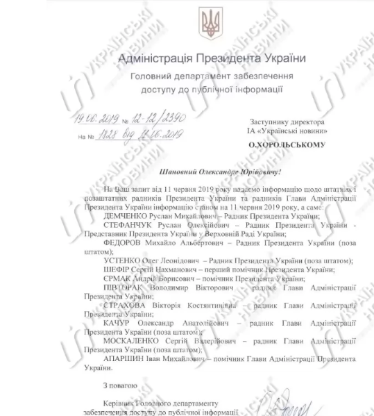Журналисты сравнили полученный список с ответом на аналогичный запрос от 20 июня и пришли к выводу, что Владимир Зеленский уволил 2 из 4 своих советников, взяв взамен двух новых. А Андрей Богдан избавился от всех 4 советников и помощника, набрав полностью новый состав из трех помощников и одного советника.