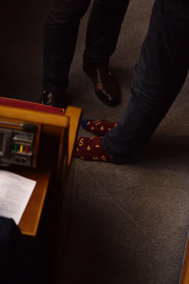 "Я как Джастин Трюдо (премьер Канады, который который известен страстью к необычным носкам - Ред.), только на украинский манер. Я ещё в Трускавце начал этот тренд против забронзовения, чтобы депутаты не превратились в говорящие головы. Чаще всего покупаю носки украинских дизайнеров: Dodo, Sammy Icon. Сегодня на мне красные носки от фирмы Under", - рассказал Алексей Жмеренецкий.