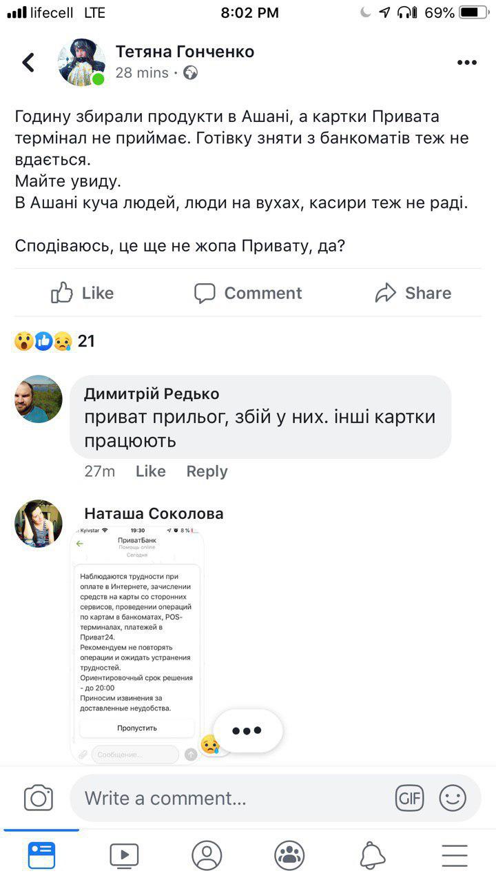 Проблемы наблюдались начиная с 18:00 при попытках воспользоваться системой "Приват24", расплатиться в супермаркетах картой и использовать терминалы самообслуживания.