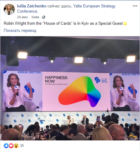 В пятницу, 13 сентября, гостьей форума "Ялтинская европейская стратегия" (YES) в Киеве стала американская актриса, звезда нашумевшего сериала "Карточный домик" Робин Райт. Об этом сообщила Юлия Зайченко в Facebook.