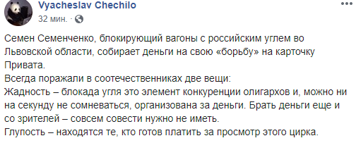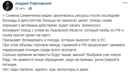 "У Семена Семенченко видно закончились ресурсы после последней блокады и депутатство больше не приносит денег, теперь снова перешел к активным действиям. Будет качать Зеленского. Блокирует поезд с углем во Львовской области, который якобы из РФ и снова просит денег на карту... Сколько времени активисты будут выше закона? Выбрали уже новую Раду. Не нравится пиши обращение, ходи на приемы, регистрируйте петиции. Нет, надо палатки, одеяло, еда, волонтеры и движ", - добавил он.