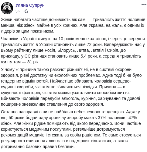Супрун рассказала, что мужчины в Украине живут на 10 лет меньше женщин, и поэтому средняя длительность жизни в Украине лишь 72 года. Опережает нас в этом рейтинге лишь Россия, Беларусь, Литва, Латвия и Сирия. В ЕС разница составляет только 5,4 года, а средняя длительность жизни там - 81 год.