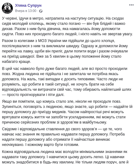 Ульяна Супрун рассказала о первой помощи и о том, почему нужно научиться ее оказывать. Кроме того, она призвала украинцев не проходить мимо, когда кому-то нужна помощь. Об этом она написала пост на Faceebook.