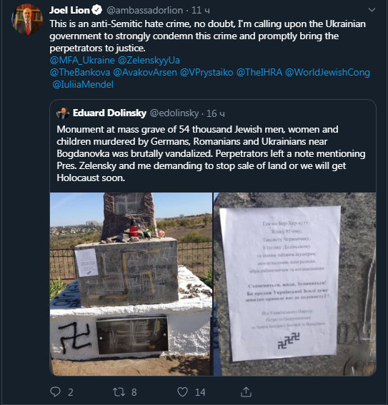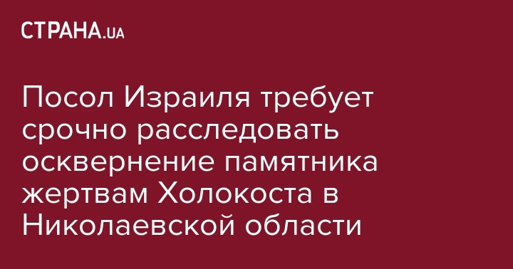 Посол Израиля в Киеве Йоэль Лион призвал украинское правительство отреагировать на осквернение памятника убитым евреям в селе Богдановка Николаевской области. Соответствующее сообщение от опубликовал в Twitter.