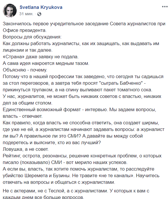 А если вы, власть, так хотите помочь журналистам, то расследуйте убийство Шеремета и Бузины. Не травите "не те каналы". Научитесь отвечать на вопросы и общаться с журналистами.