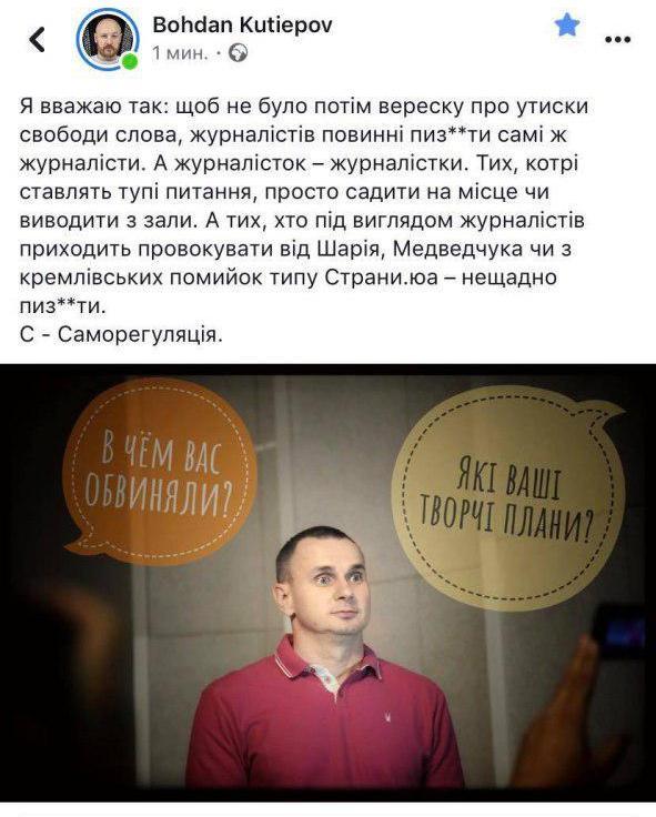 Напомним, что Громадське ТВ уже осудило заявление Богдана Кутепова. "ОО "Громадське ТВ" осуждает любые проявления и призывы к насилию, как и любые высказывания, унижающие людей. Организация осуждает публичные высказывания журналиста Богдана Кутепова в социальных сетях в адрес журналистов, работавших на пресс-конференции Олега Сенцова и Александра Кольченко и считает их недопустимыми", - сказано в заявлении.