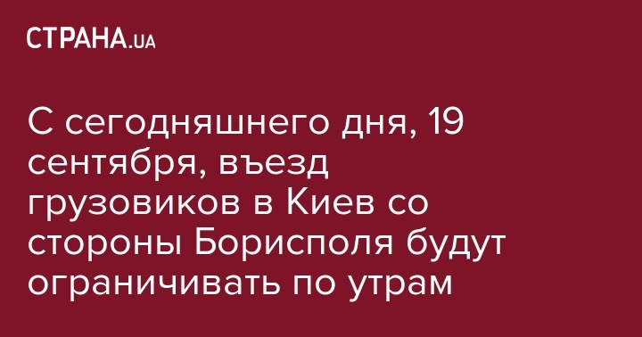 Начиная с сегодняшнего дня, 19 сентября, въезд грузового транспорта в Киев со стороны Борисполя будет ограничен каждое утро с 7:00 до 10:00 на постоянной основе. Об этом сообщает пресс-служба Киевской городской государственной администрации в понедельник, 16 сентября.