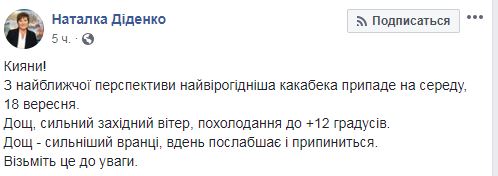 "В ближайшей перспективе вероятная какабека придется на среду, 18 сентября", – написала она.