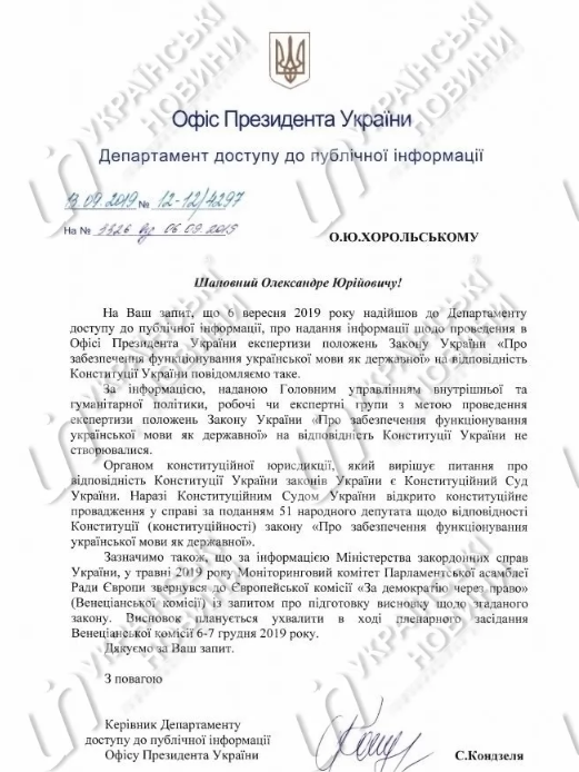 "Органом конституционной юрисдикции, который решает вопросы о соответствии Конституции законов, является Конституционный Суд (КСУ). При этом, в КСУ открыто конституционное производство в вопросе по представлению 51 народного депутата о соответствии Конституции закона "Об обеспечении функционирования украинского языка как государственного", - говорится в ответе ОПУ.