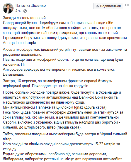 "Даже если идет атмосферный фронт, то это не значит, что дождь будет главным. Нет. Атмосфера учитывает все метеорологические нюансы, все в комплексе... Поскольку холодный воздух тяжелый, он будет давить, а Украина еще и окажется между мощным антициклоном... Hanneke и циклоном Ignaz. И вот пока эти два уважаемые атмосферные джентельмены будут бороться за зоны влияния, все, кто между ними, а это немалый кусок континентальной Европы, включая Украину, будут ощущать последствия этой борьбы - сильный, до штормового, ветер", - написала Наталья Диденко.