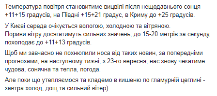 Температура воздуха, по данным Диденко, ожидается на уровне +11...+15 градусов, на юге +15...+ 21 градуса, в Крыму до +25 градусов. В Киеве среда будет влажной, холодной и ветреной. Порывы ветра будут достигать сильных значений, до 15-20 метров в секунду, похолодает до +11...+13 градусов.