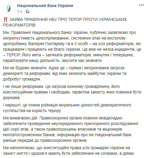 Также в Правлении НБУ потребовали скорейшего расследования серии атак на Гонтареву.