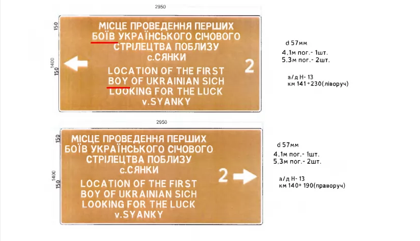 Как выяснилось, в рамках этой программы департамент культуры провел в июле этого года тендер на изготовление более 50 различных указателей во всей области - и практически все они изготовлены с ошибками. Победитель тендера ООО "Дорожные знаки" уже получил на это почти 581 тысяч гривен из областного бюджета.