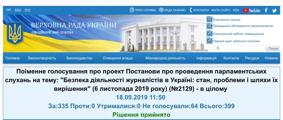"Проголосовали за проведение парламентских слушаний по теме безопасности работы журналистов. За - 335. Впервые за многие годы расследованию дела об убийстве Олеся Бузины будет дана объективная публичная политическая оценка. Надеюсь на справедливую и быструю реакцию новых руководителей правоохранительных органов на парламентскую инициативу", - сообщил Кузьмин.