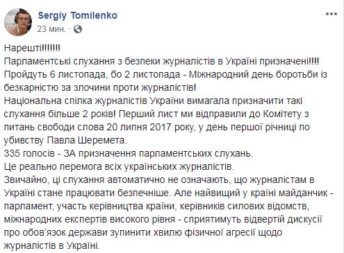 Информацию о парламентских слушаниях по безопасности журналистов подтвердил и глава Национального союза журналистов Украины (НСЖУ) Сергей Томиленко. Он написал в Facebook, что НСЖУ требовал назначить следующие слушания больше 2 лет. "Первое письмо мы отправили в Комитет по вопросам свободы слова 20 июля 2017 года, в день первой годовщины по убийству Павла Шеремета... Это реально победа всех украинских журналистов", - пишет Томиленко.