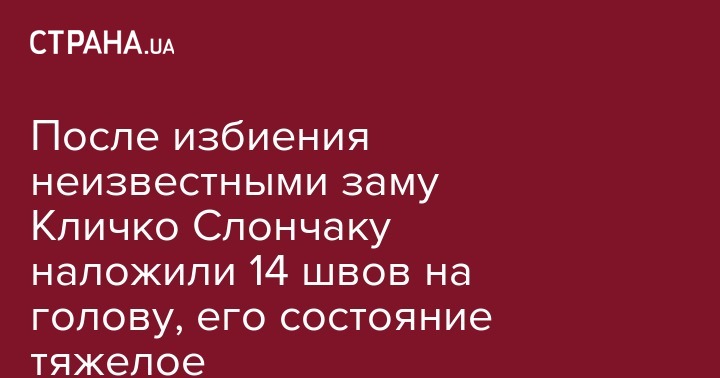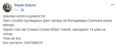 "Пресс-служба подтверждает факт нападения на Владимира Слончака вчера вечером. Сейчас состояние заместителя председателя КГГА тяжелое, наложено 14 швов на голову. Пока это все", - говорится в сообщении.