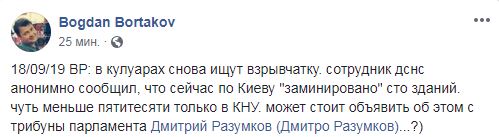 "В кулуарах снова ищут взрывчатку", - написал он. По его данным, сотрудник ГСЧС анонимно ему сообщил, что сейчас по Киеву "заминировано" сто зданий и "чуть меньше пятидесяти только в КНУ". Впрочем, что значит фраза "чуть меньше пятидесяти только в КНУ" журналист не пояснил.
