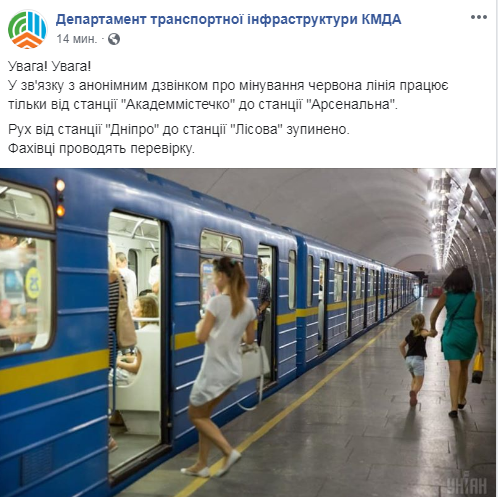 "Участок от станции "Дарница" до станции "Крещатик" проверяется специалистами", - появилось уточняющее сообщение на странице Киевского метро в Фейсбуке.