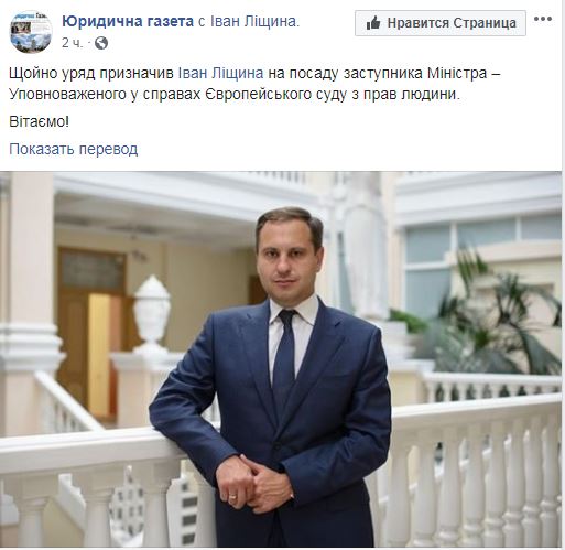 Кабинет министров Украины переназначил Ивана Лищину на должность заместителя министра юстиции Украины - уполномоченного по делам Европейского суда по правам человека (ЕСПЧ). об этом сказано на странице Лищины в Facebook в среду.