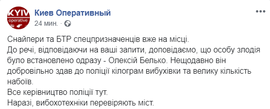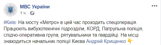 Кроме того, как сообщили в МВД, на мосту Метро в данный момент проводится спецоперация. Работают взрывотехнические подразделения, КОРД, Патрульная полиция, следственно-оперативная группа, спасатели и гвардейцы. Также на месте находится глава полиции столицы Андрей Крищенко.