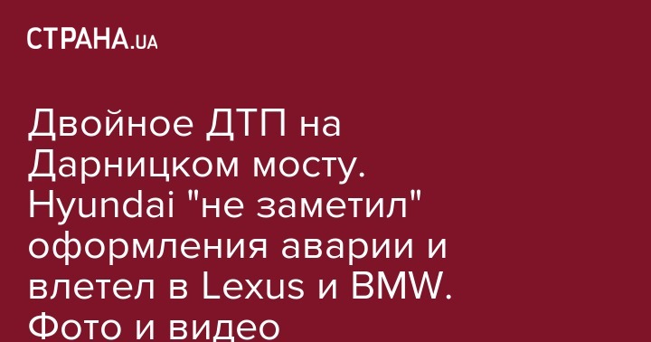 Вчера, 18 сентября, поздним вечером на Дарницком мосту в Киеве произошло двойное ДТП. Lexus слегка "догнал" BMW и пока обе машины ожидали оформления аварии в них влетел Hyundai. От удара Lexus смяло и отбросило в отбойник. Три человека попали в больницу. Об этом сообщает Информатор.