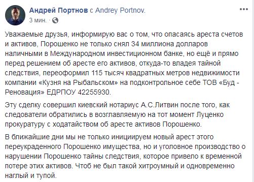 "Порошенко не только снял 34 миллиона долларов наличными в Международном инвестиционном банке, но еще и прямо перед решением об аресте его активов, откуда-то владея тайной следствия, переоформил 115 тысяч квадратных метров недвижимости компании "Кузня на Рыбальском" на подконтрольное себе ТОВ "Буд - Реновация" ЕДРПОУ 42255930", - сообщил Портнов.