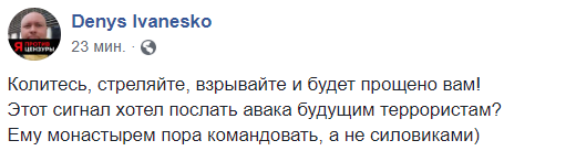 "Колитесь, стреляйте, взрывайте и будет прощено вам! Этот сигнал хотел послать авака будущим террористам? Ему монастырем пора командовать, а не силовиками", - возмущается журналист Денис Иванеско.
