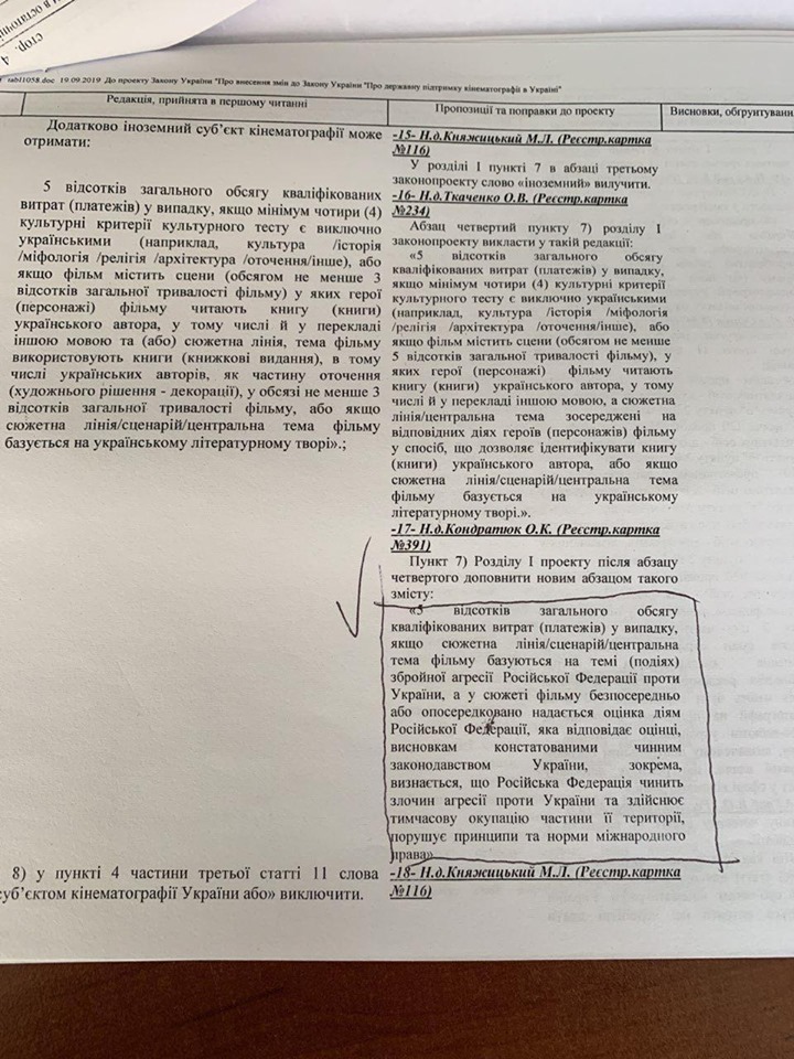 "Как видите, даже в таких мирных вопросах как кино нашлось место для войны: предложено доплачивать по 5% из государственного бюджета производителям антироссийских фильмов. Несмотря на протесты представителей фракции ОПЗЖ, комитет проголосовал за эту поправку, заменив, правда, слова "Российская Федерация" на слова "страна-агрессор", что, впрочем, не меняет ее сути", - написал Кузьмин.