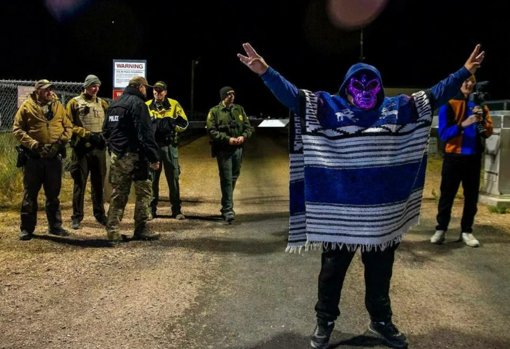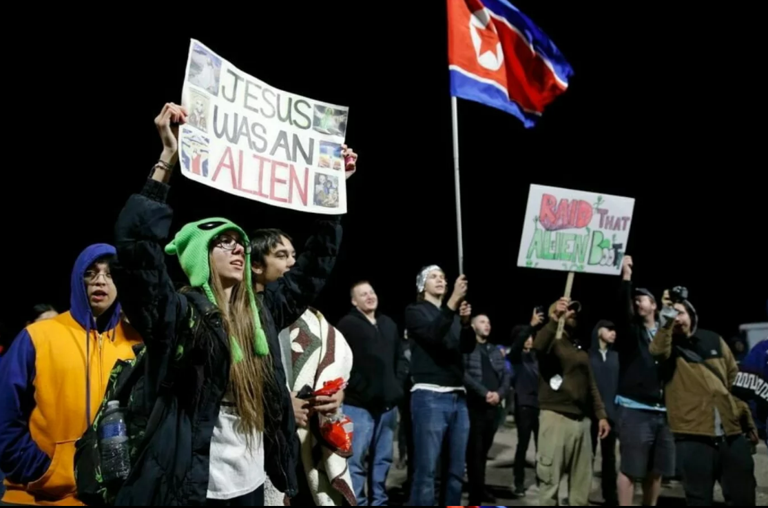 К контрольно-пропускному пункту базы освободители внеземного разума подошли в три часа ночи. Многие из них были в костюмах, масках и с плакатами вроде: "За что заточили инопланетян" и "Иисус был инопланетянином".