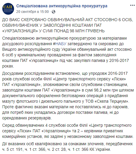 В Высший антикоррупционный суд Украины направлен обвинительный акт в отношении шести лиц, обвиняемых в завладении средствами "Укрзализныци" в сумме около 98 млн грн. Об этом сообщает пресс-служба Специализированной антикоррупционной прокуратуры в Facebook.