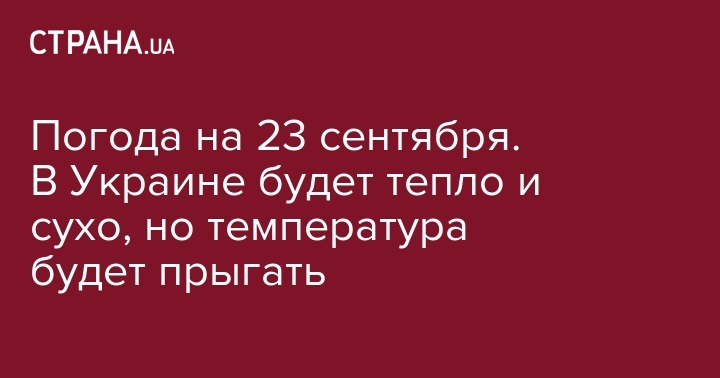 Сегодня, 23 сентября, погода в Украине будет в целом сухой и солнечной, однако температура в разных регионах будет кардинально отличаться. Об этом синоптик Наталка Диденко написала на своей странице в Facebook.