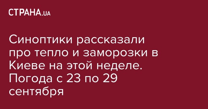 Погода в Киеве на этой неделе будет переменчивой, температура днем будет преобладать осенняя от +11 до +18 градусов, ночью возможно похолодание до +3...+5 градусов и заморозки до 4 мороза. Дожди обещают лишь в четверг и пятницу, 26 и 27 сентября. Этот период порадует киевлян сухой погодой, когда можно ходить без зонта в замшевой обуви, а также фотографировать себя и друзей в золотой листве. Потепление до +20 и выше сдвигается на неделю.