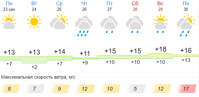 Во вторник солнечно, на термометре до +15. В среду потеплеет до +17, прогнозируют переменную облачность. В четверг и пятницу - дожди. Температура ночью +7...+8 градусов, днем +16..+17.