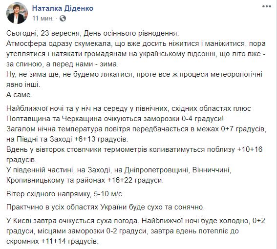 Синоптик Наталья Диденко сообщила, что в день осеннего равноденствия 23 сентября пришло время утепляться. Этой ночью в Полтавской и Черкасской областях ожидаются заморозки до 0-4 мороза. Ночная температура - в пределах 0...+7 градусов; в западных и южных областях +6...+13.