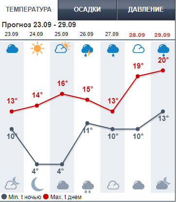 Прогноз Мeteoprog.ua наиболее точно показывает переменчивость погоды на этой неделе. Если дневная температура будет расти с +13 градусов в понедельник до +20 градусов в воскресенье, то ночная будет около +10...+13.