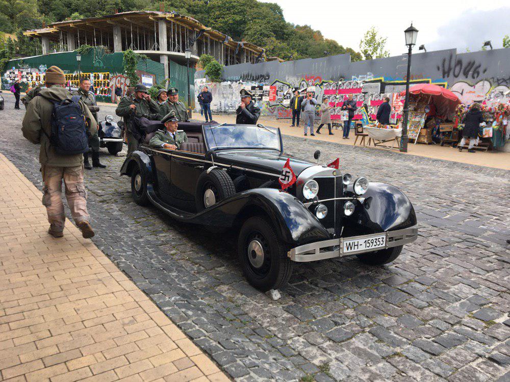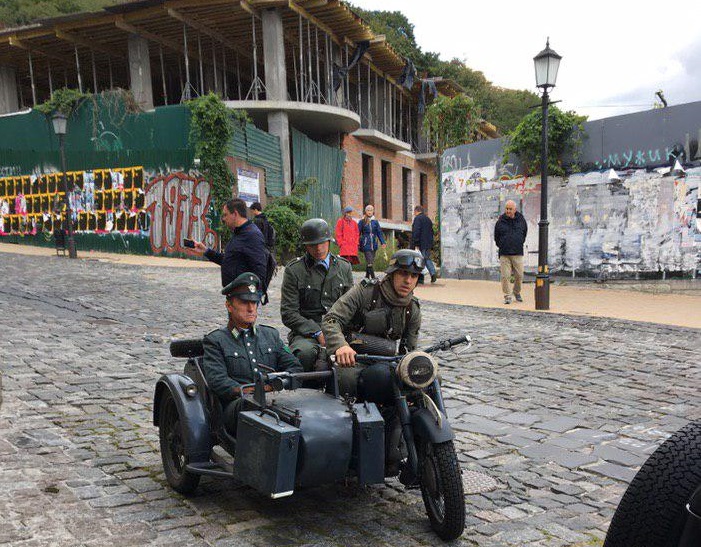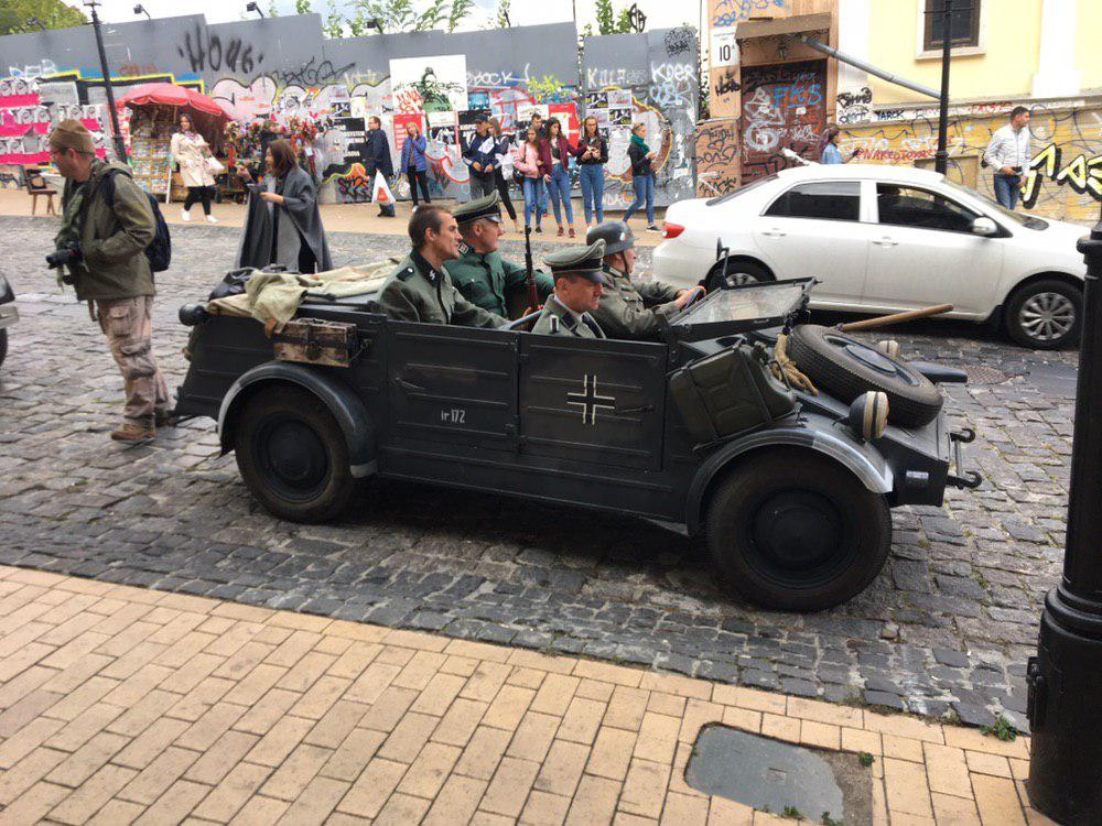 Стоит отметить, что подобные декорации были расставлены и в начале уикэнда на Андреевском спуске, где также снимали эпизод художественного фильма. На исторической улице, которую уже давно облюбовали художники и ремесленники, люди в форме солдат Вермахта разъезжали на мотоциклах и автомобилях того времени, пишет "Наш Киев".