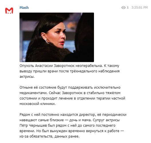 Стали известны новые подробности тяжелой болезни популярной российской актрисы Анастасии Заворотнюк, которой медики диагностировали рак мозга. По последним данным, развившаяся у нее опухоль неоперабельна. К такому выводу пришли врачи после трехнедельного наблюдения актрисы, сообщает телеграм-канал Mash.