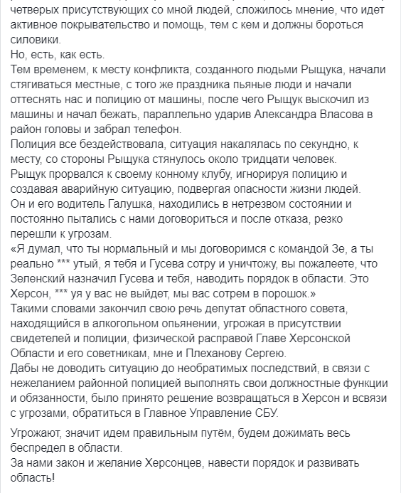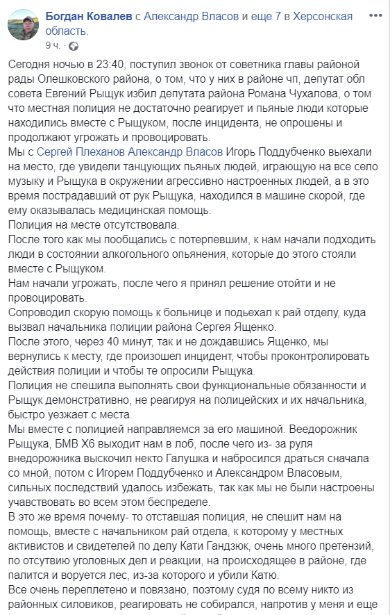 Как сообщил в Facebook советник председателя ОГА Богдан Ковалев, в 23:40 поступил звонок от советника председателя районного совета Олешковского района о том, что у них в районе ЧП: депутат облсовета Евгений Рыщук избил депутата района Романа Чухалова, а "местная полиция недостаточно реагирует".