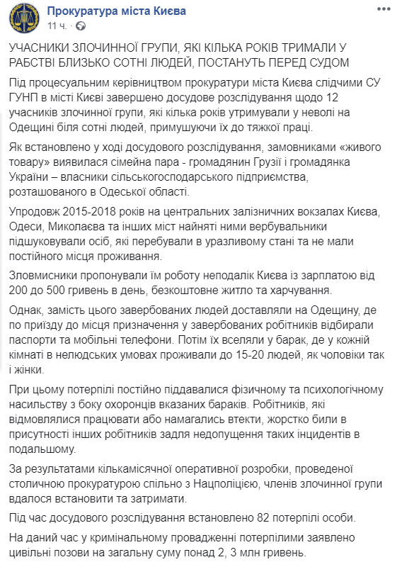 "Как установлено в ходе предварительного расследования, заказчиками "живого товара" оказалась семейная пара - гражданин Грузии и гражданка Украины - владельцы сельскохозяйственного предприятия, расположенного в Одесской области. В течение 2015-2018 гг на центральных железнодорожных вокзалах Киева, Одессы, Николаева и других городов нанятые ими вербовщики подыскивали лиц, находящихся в уязвимом состоянии и не имевших постоянного места жительства", - говорится в сообщении.