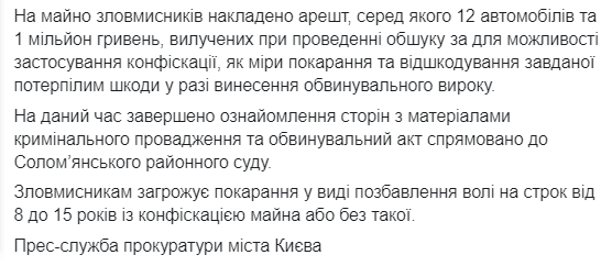 В настоящее время завершено ознакомление сторон с материалами уголовного производства, и обвинительный акт направлен в Соломенский районный суд Киева. Злоумышленникам грозит наказание в виде лишения свободы на срок от 8 до 15 лет с конфискацией имущества или без таковой.